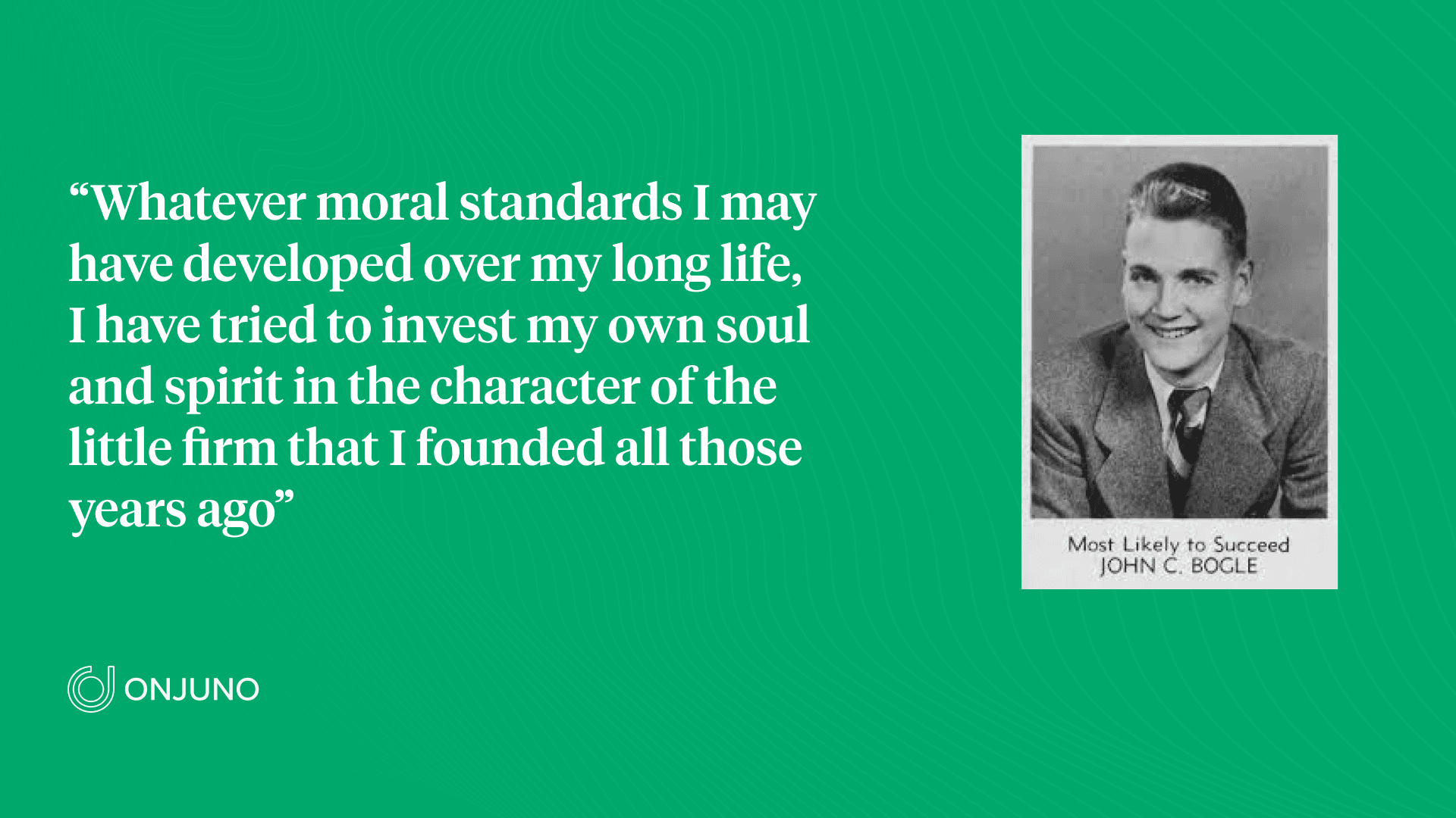 As a scholarship student at Princeton, Bogle claimed he earned average grades. But his senior thesis on the ins, outs, and potential influence of the mutual fund industry was anything but average. The 130-page paper ended up laying the groundwork for his entire investing philosophy and caught the eye of Walter Morgan, founder of the Wellington Fund, who hired Bogle in 1951.