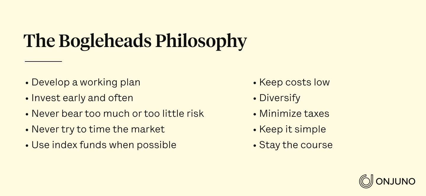 In addition, Bogleheads preach simple—even downright old-fashioned—strategies like regular saving, mediating risk, and keeping an eye on the big picture. The official Boglehead investment philosophy has 10 points: