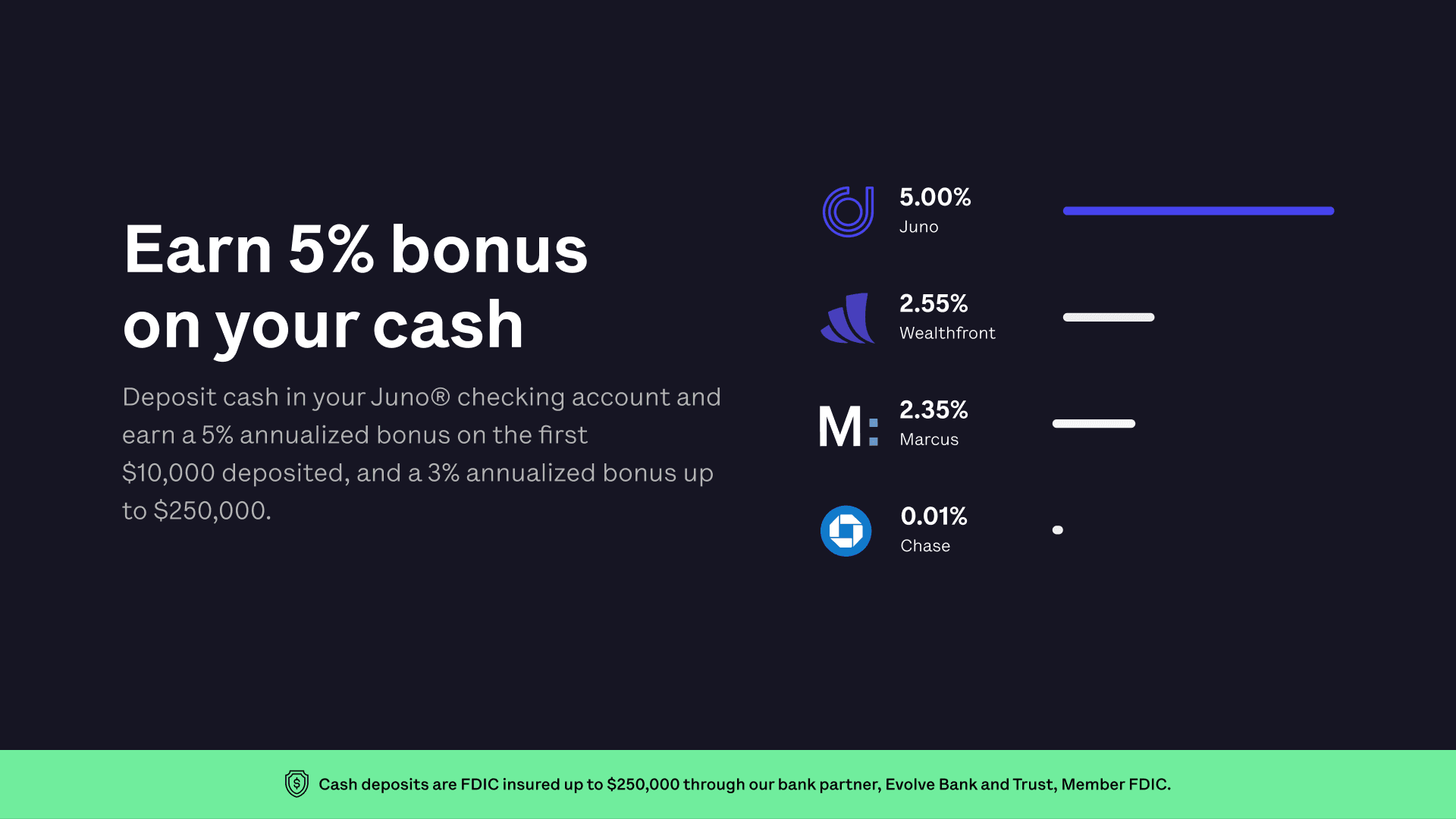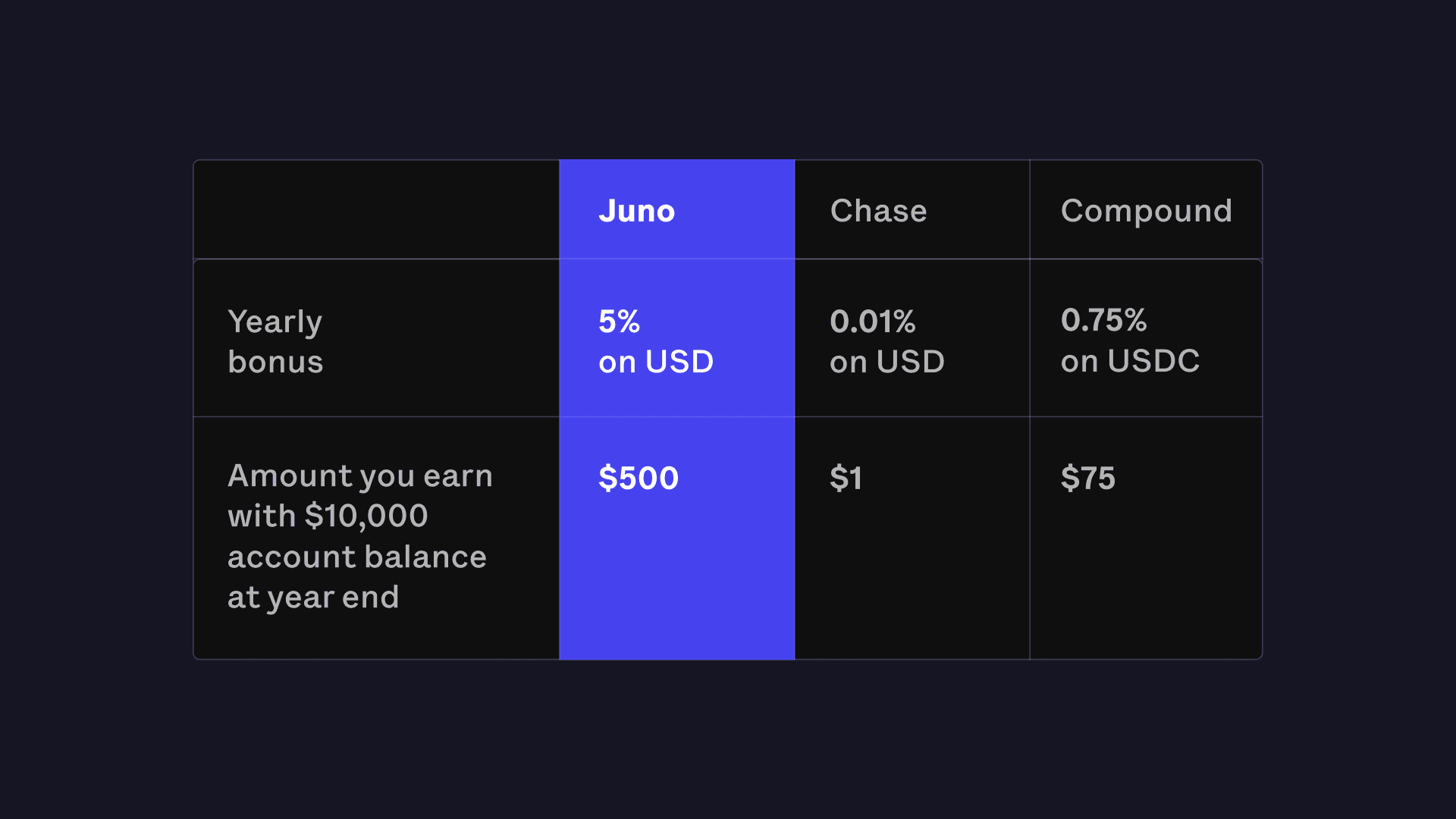 Your Juno account now earns a 5% bonus for the year from October 19, 2022. As per the new bonus model for USD Deposits, you earn 5% for balances up to $10,000, and 3% for balances over $10,000 up to $250,000.