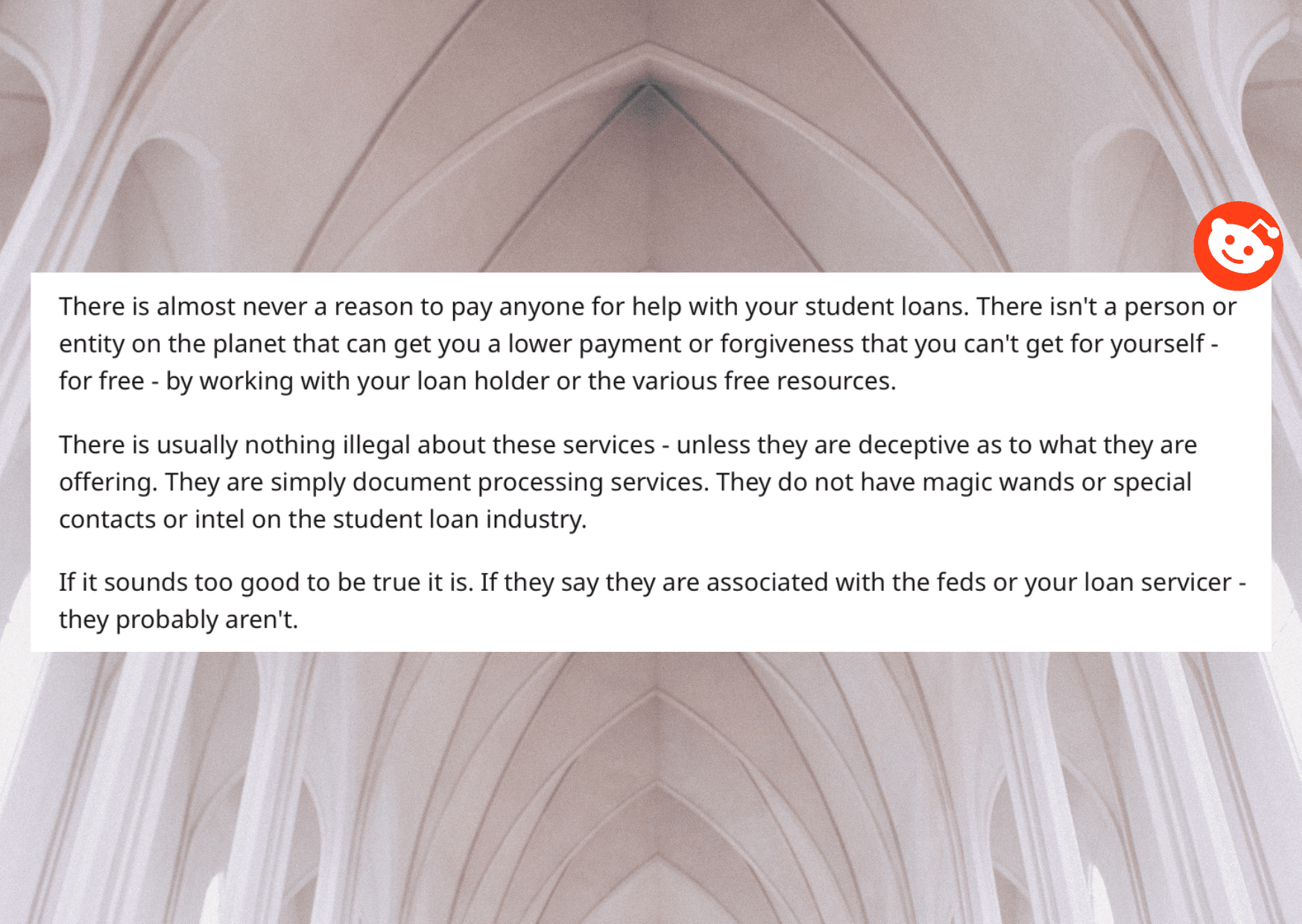 It can be tempting to sign up for services claiming to handle your student loans for you, but the cost just isn’t worth it. Reddit user “