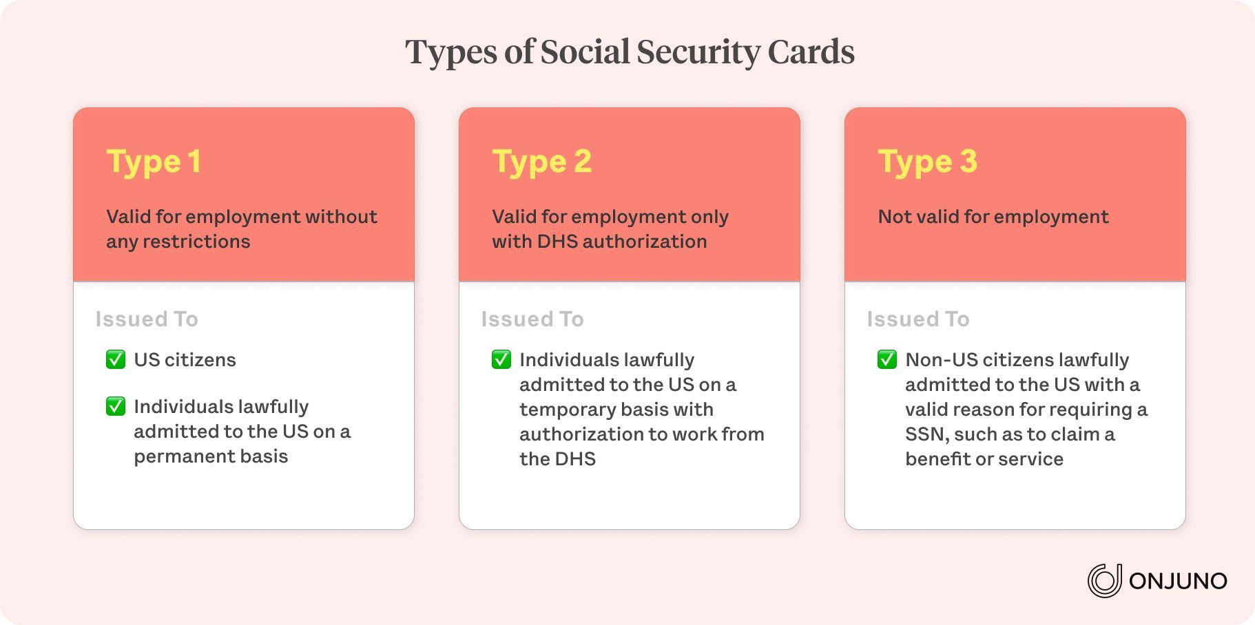 The SSA typically issues three types of Social Security cards. All cards display the name of an individual and their Social Security number.
