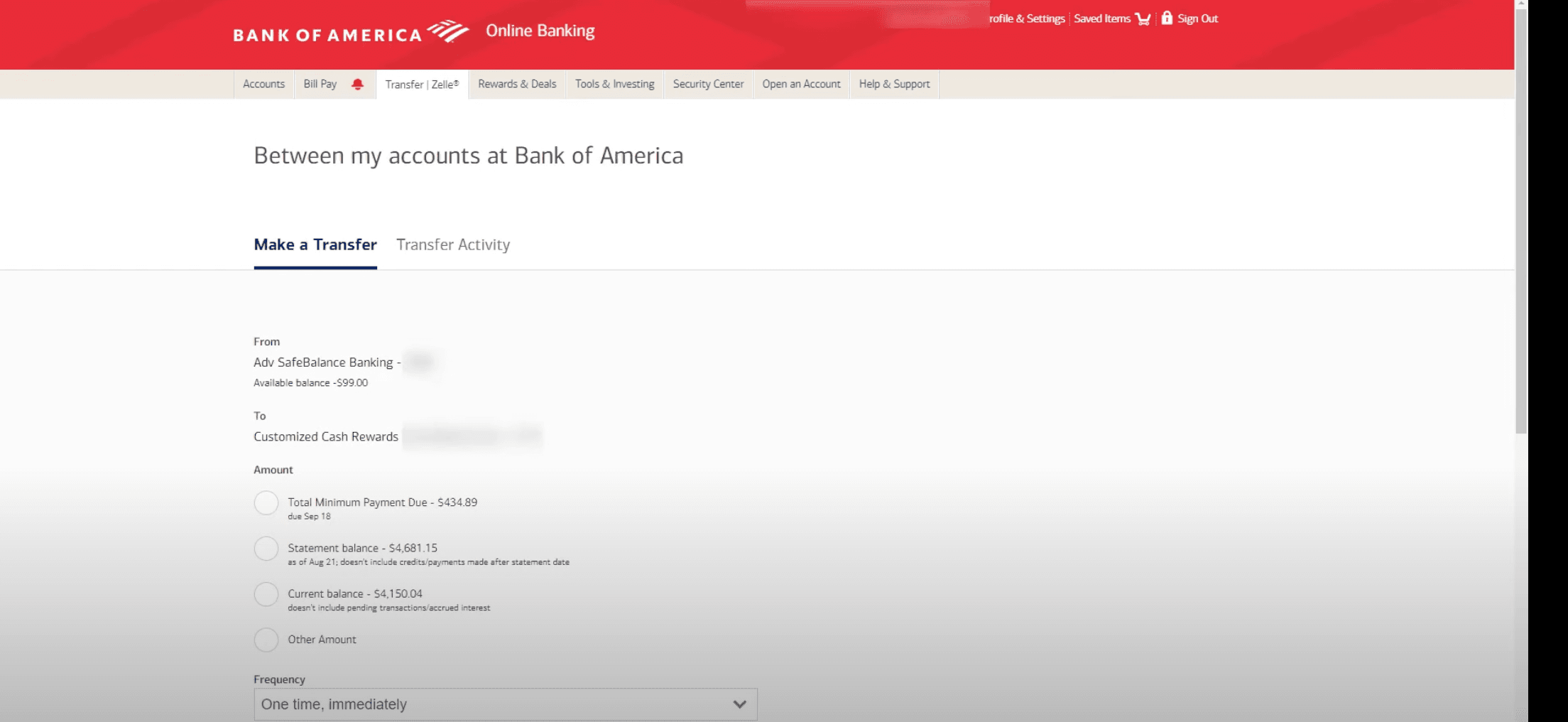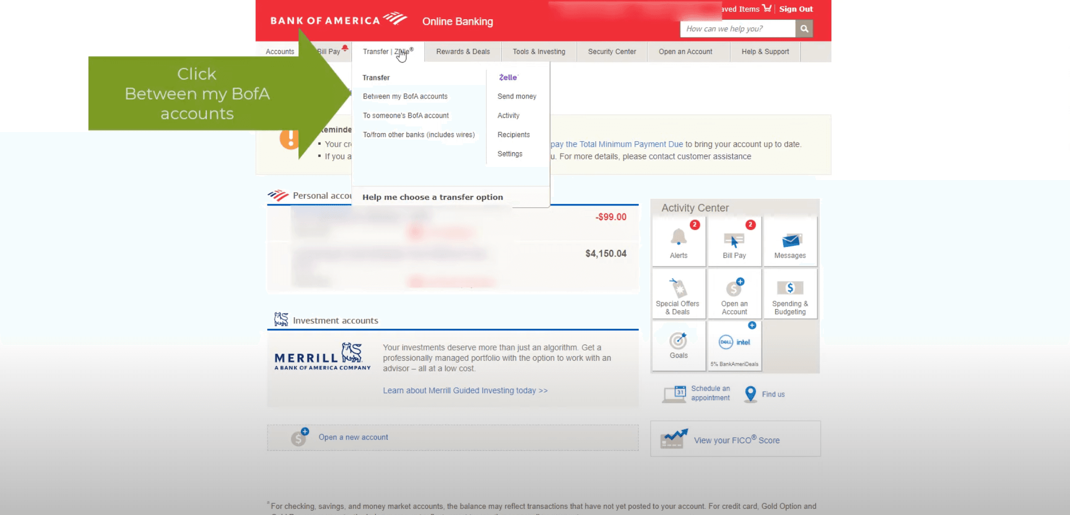 2. Click on the “Transfer|Zelle” option located at the top menu, and under it, select the “Between my BofA” account” option.