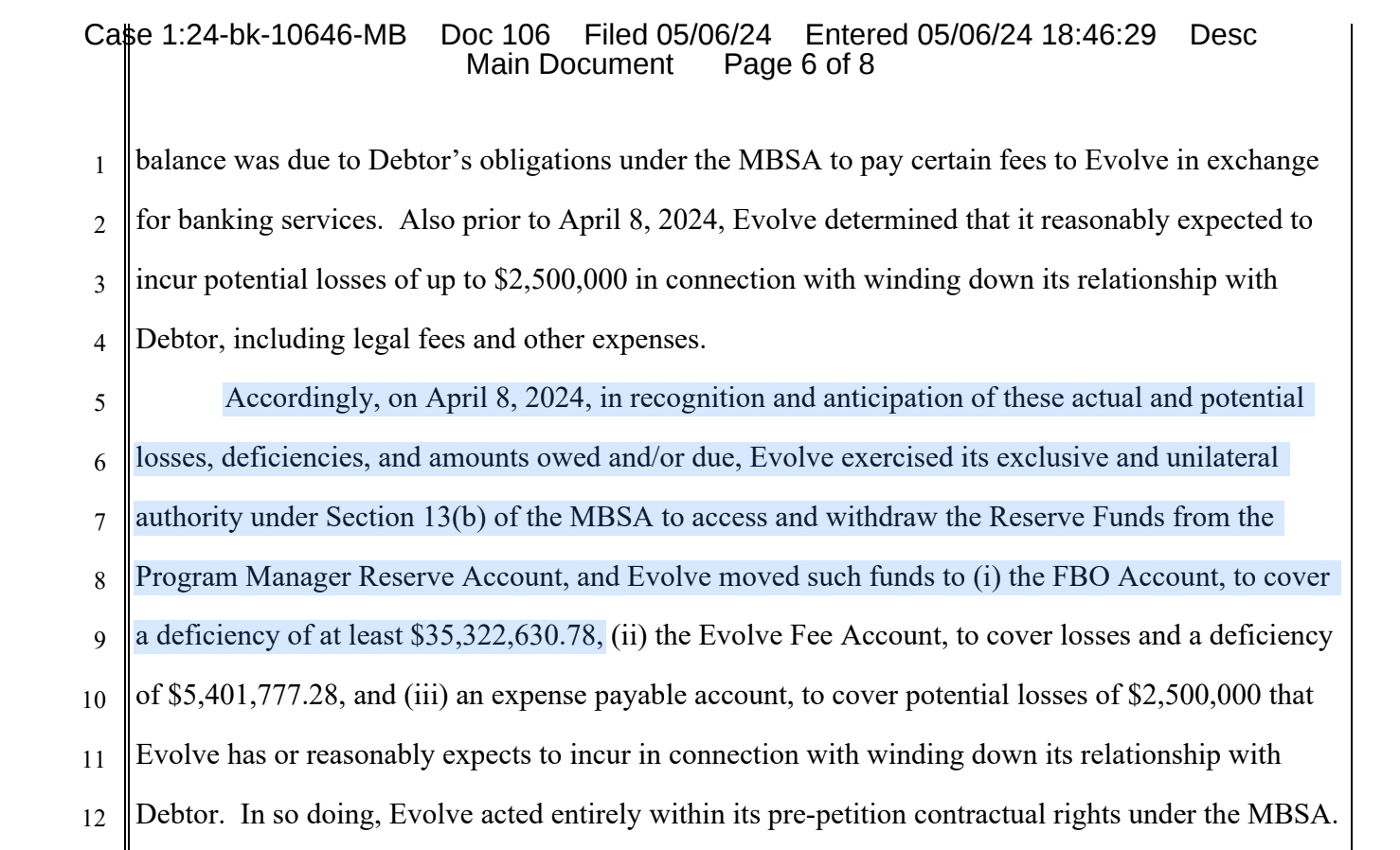 Furthermore, since Evolve Bank & Trust and Lineage had advocated for pro rata disbursals while their reconciliation efforts continued, we are awaiting instructions from these banks to facilitate pro rata withdrawals but neither of them have given us the next steps so far.