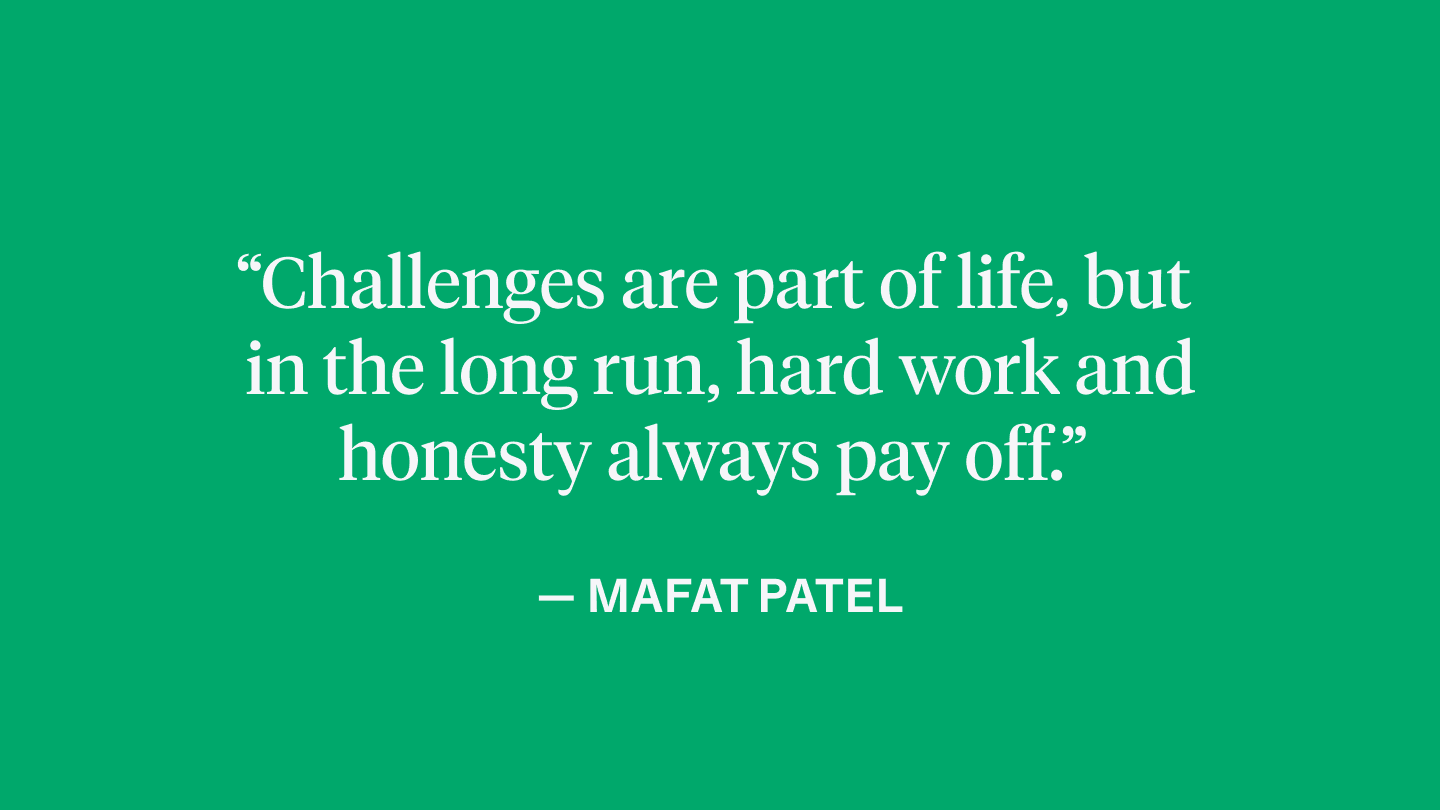 “Challenges are part of life, but in the long run, hard work and honesty always pay off.” — Mafat Patel
